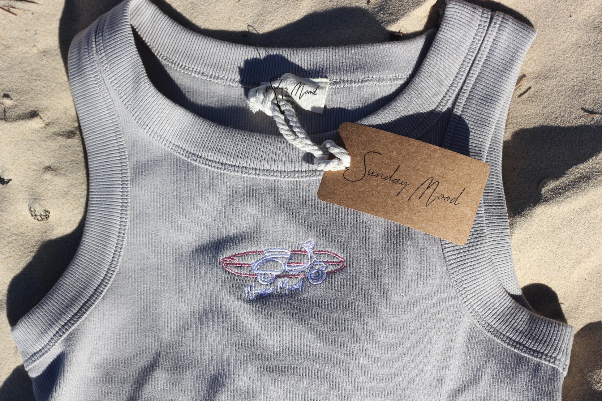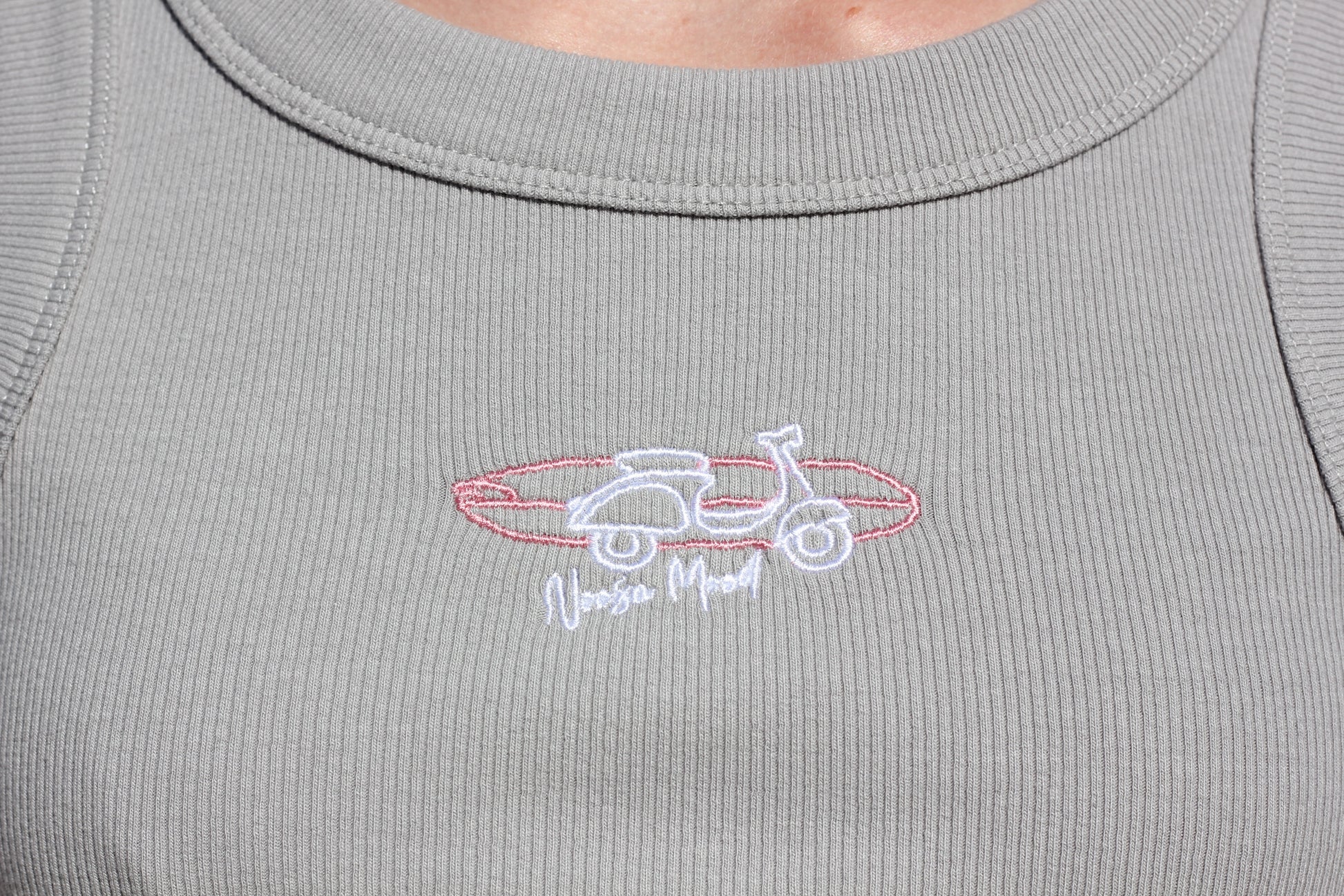 Noosa Mood Crop Tank Olivia light grey colour is made in high quality organic cotton with delicate embroidery featured at the centre front, showcasing a charming Vespa and longboard design in subtle off-white and soft pink tones.