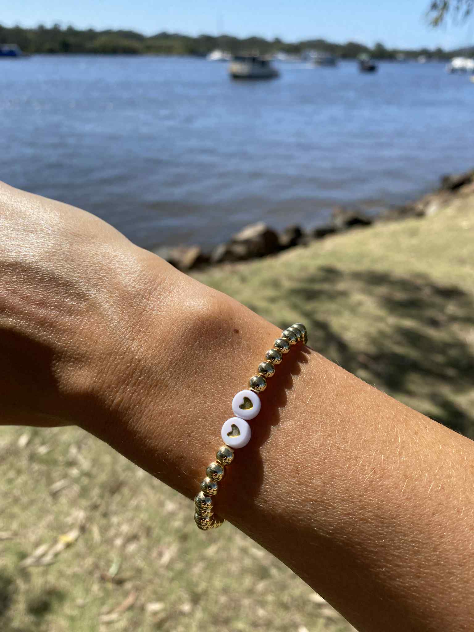 Elevate your style with our delicate golden beaded bracelet Scarlett. Crafted with small, shimmering gold beads and elastic for a comfortable fit, this bracelet is perfect for layering or wearing alone as a subtle statement. Each bracelet features one, two, three, or four charming white-golden hearts adding a touch of elegance and sweetness to your wrist.