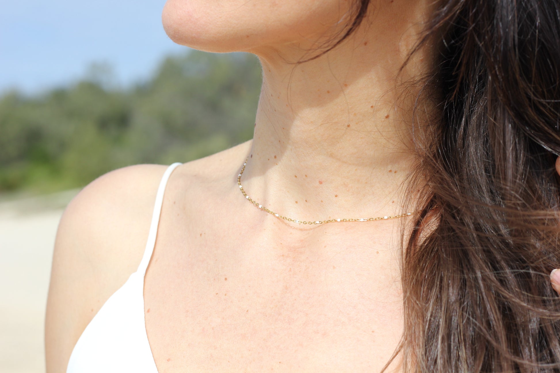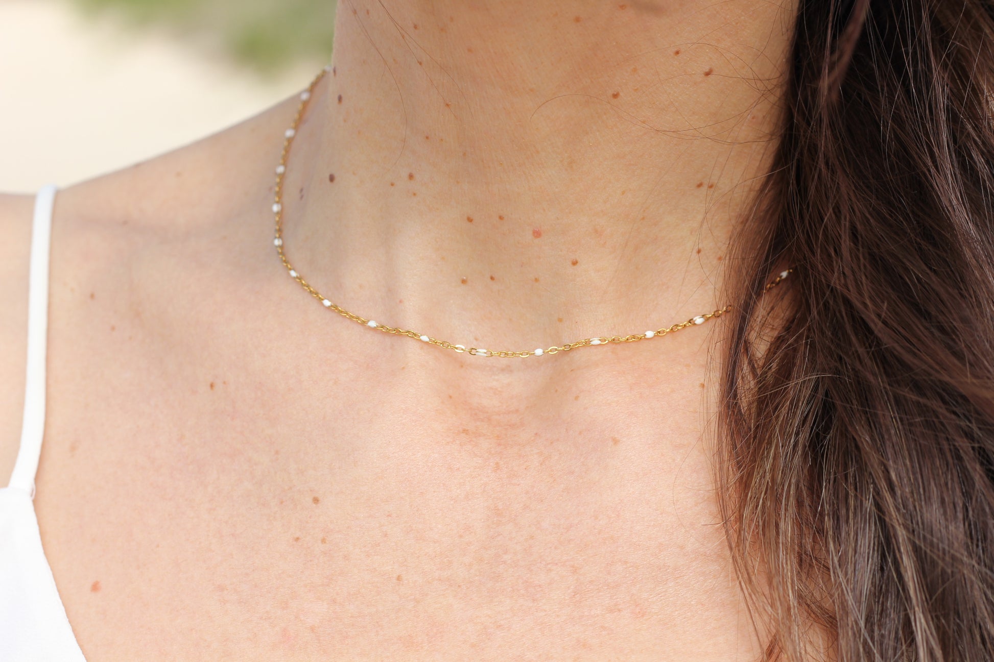 Golden white necklace Grace is a timeless piece that pairs with any outfit. Its simplicity creates a unique and eye-catching look that is sure to make a statement. You can wear it individually or layered with other fine necklaces.