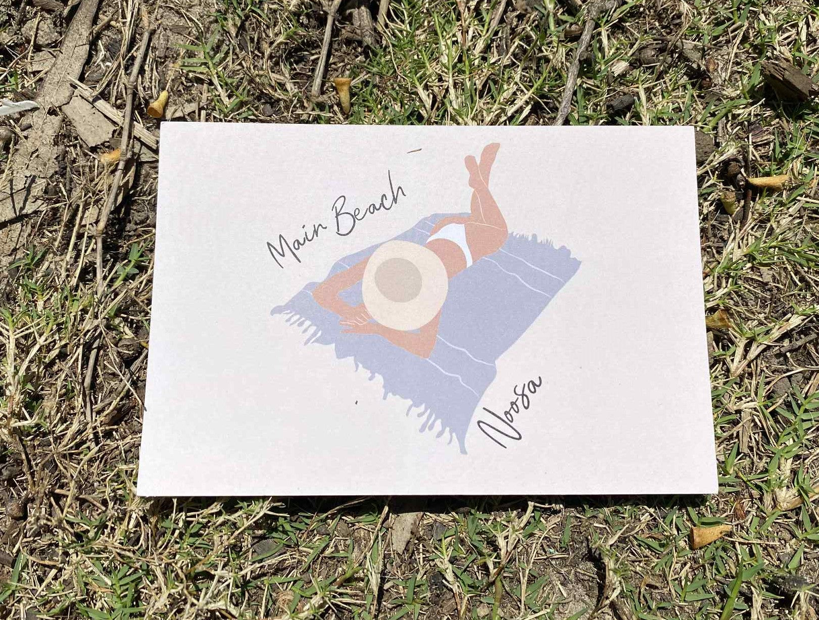 An elegant illustration of a woman lying on a beach towel at Main Beach, Noosa. Seen from behind, her face is hidden beneath a wide-brimmed hat, adding a touch of mystery and relaxation. This postcard perfectly captures the laid-back coastal vibe, making it a beautiful keepsake or gift for beach lovers and travellers.