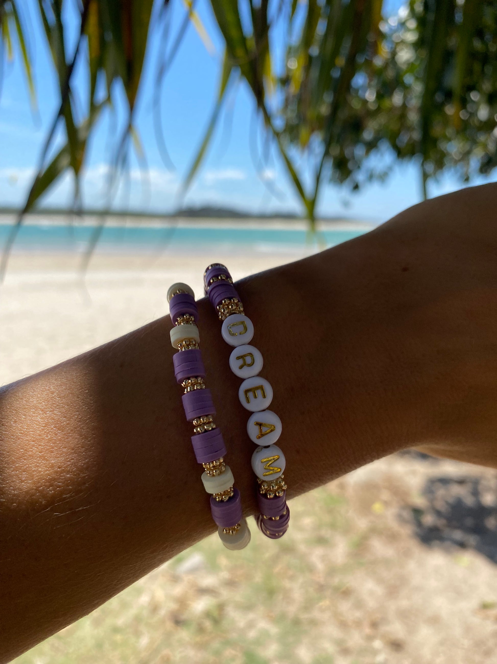 Pop Heishi clay disc bead, white and gold letters strung with durable stretchy elastic string making them easy to take on and off for daily wear.