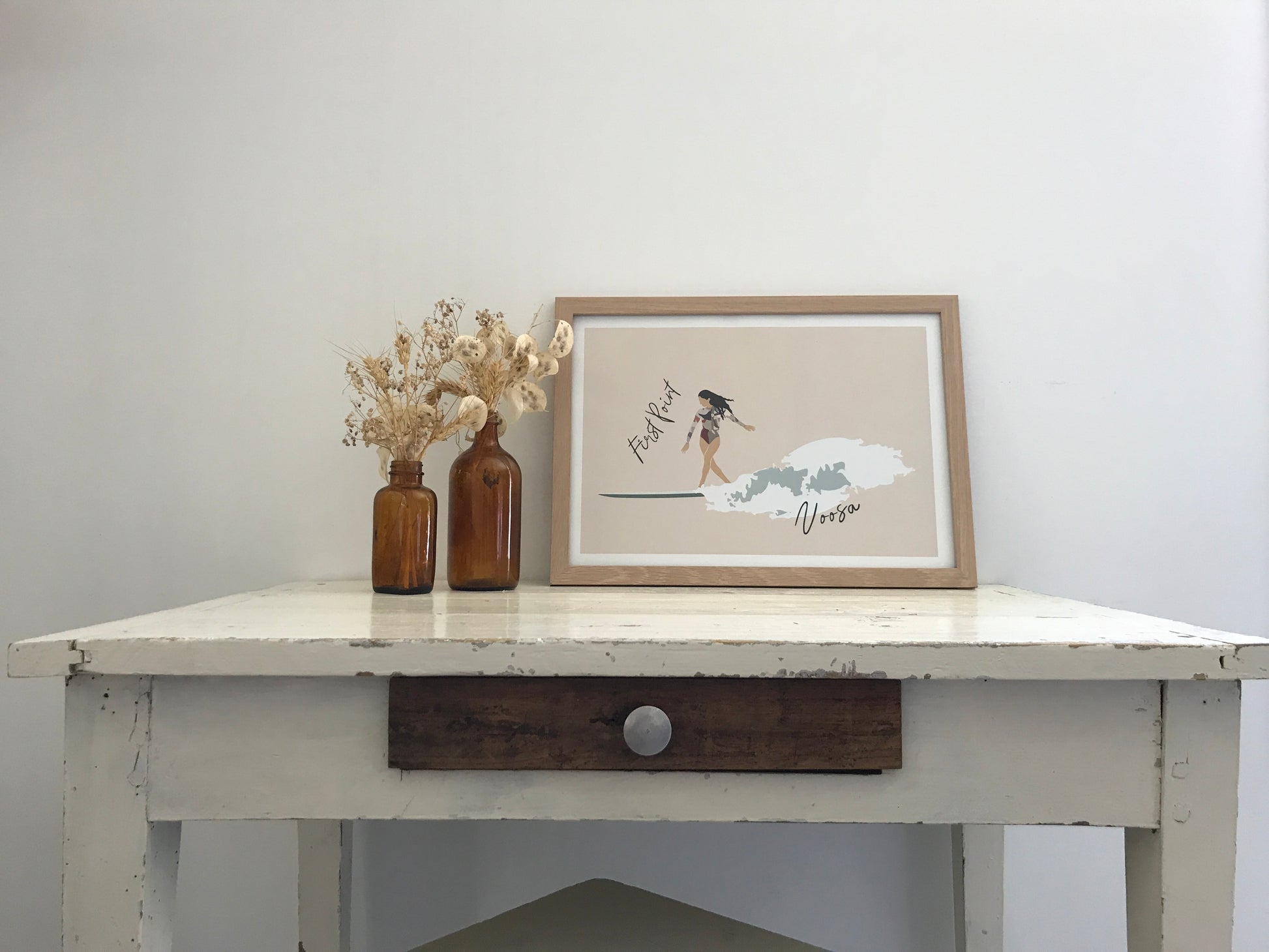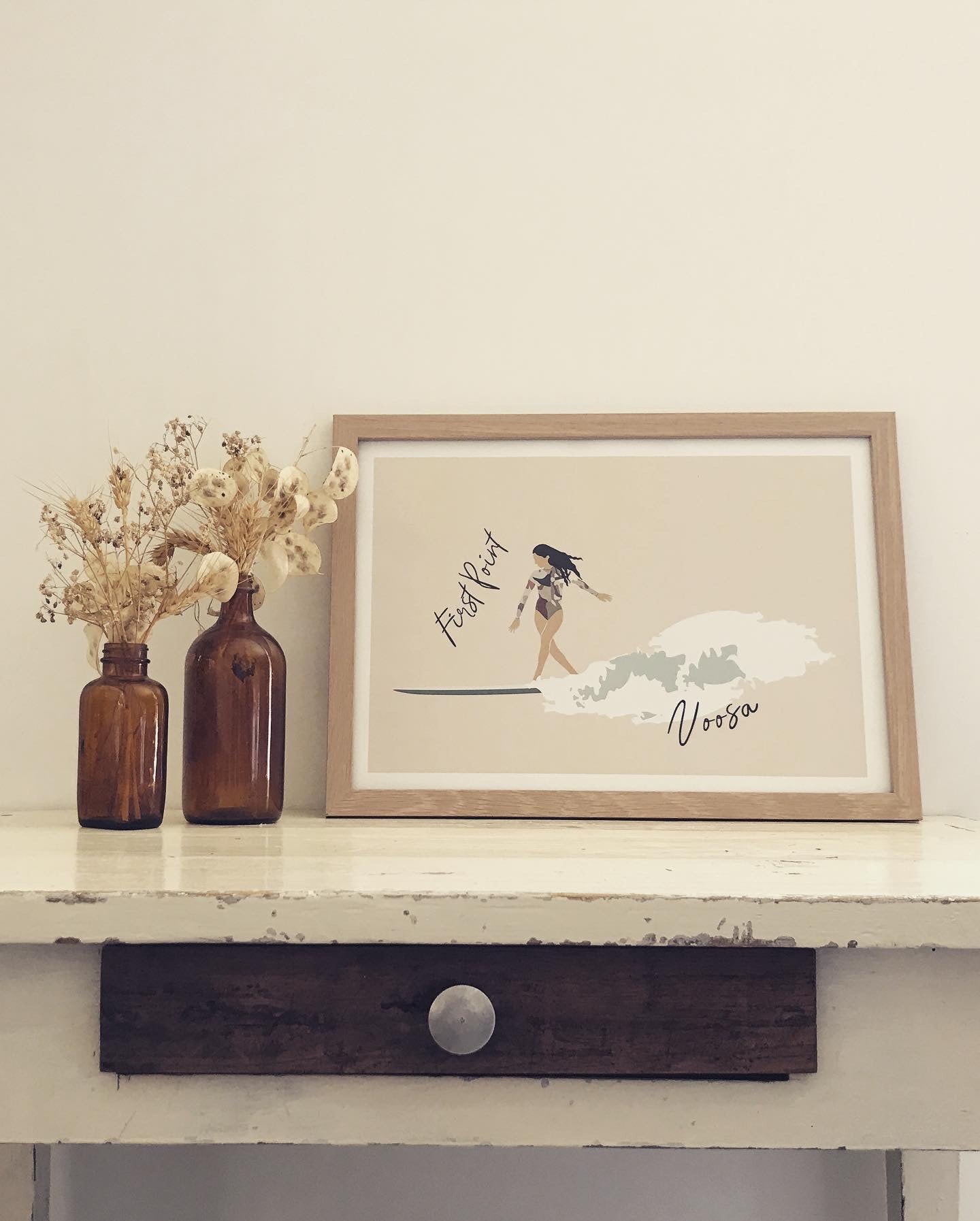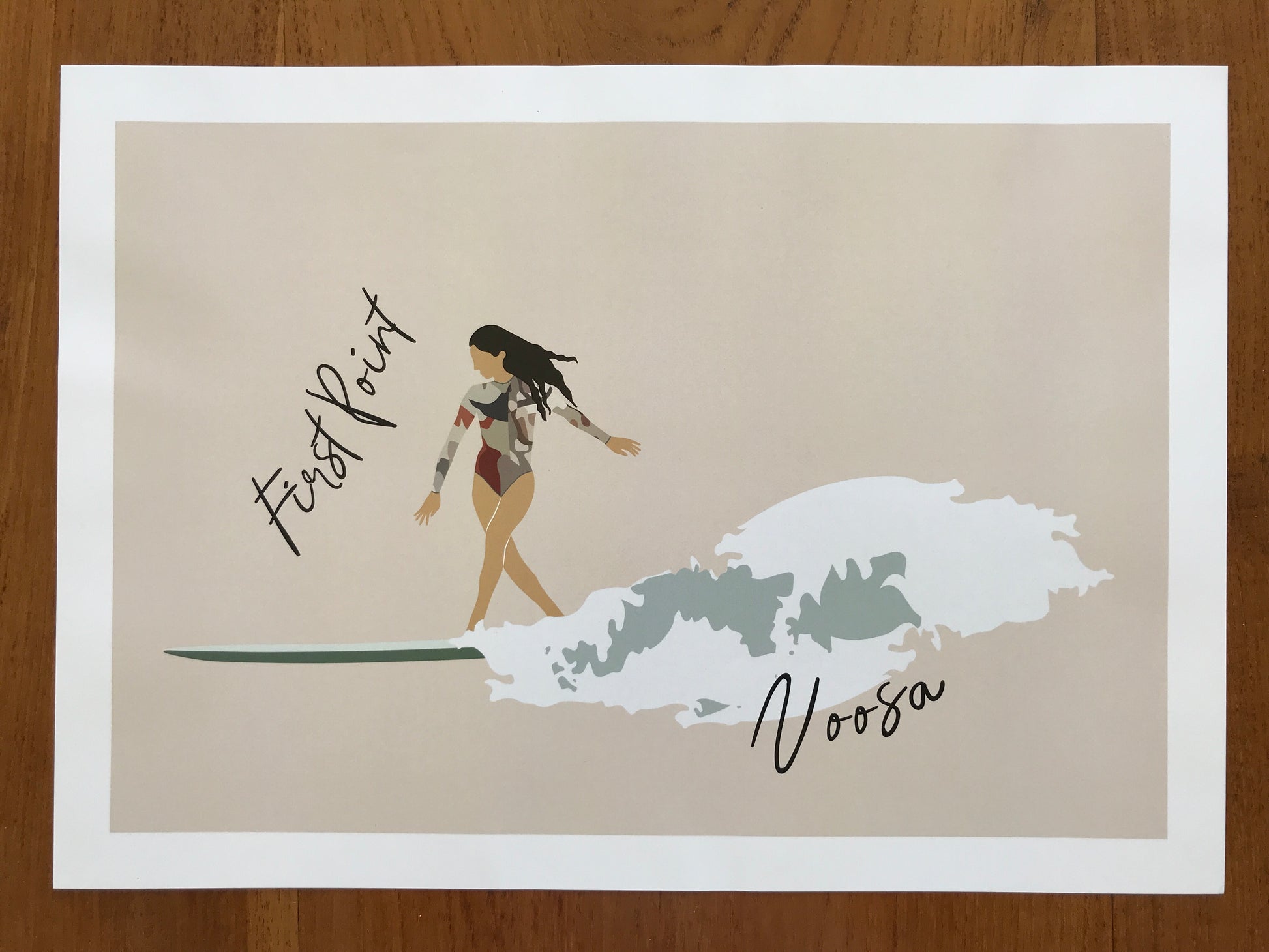 Capture the sunny, laid-back vibe of the iconic First Point on Main beach in Noosa with this beautifully illustrated A3 poster. It features a graceful woman surfing on a longboard, effortlessly riding a stunning turquoise wave. A vibrant yet serene design, perfect for sharing travel memories or adding a touch of ocean-inspired charm to your collection.
