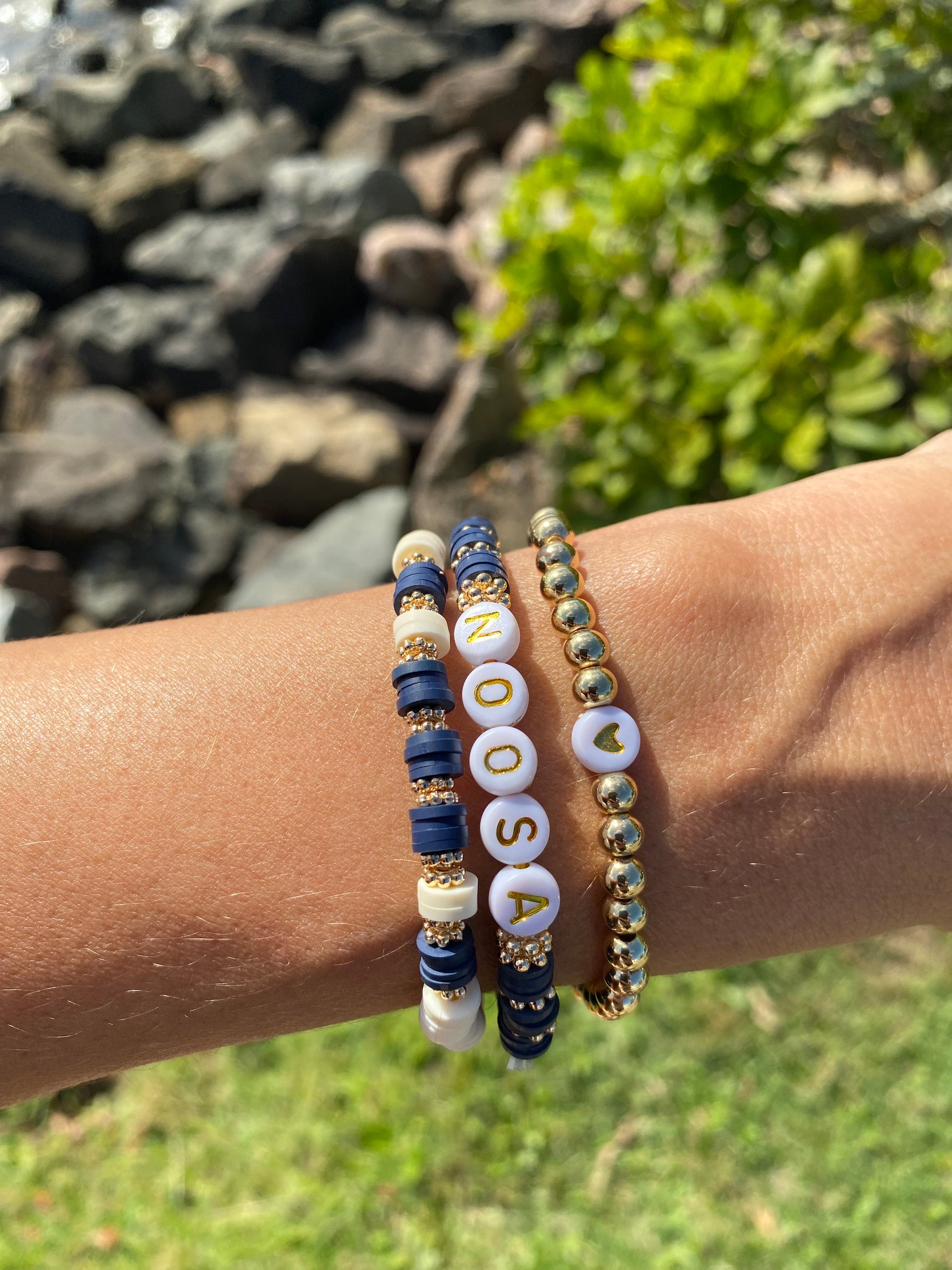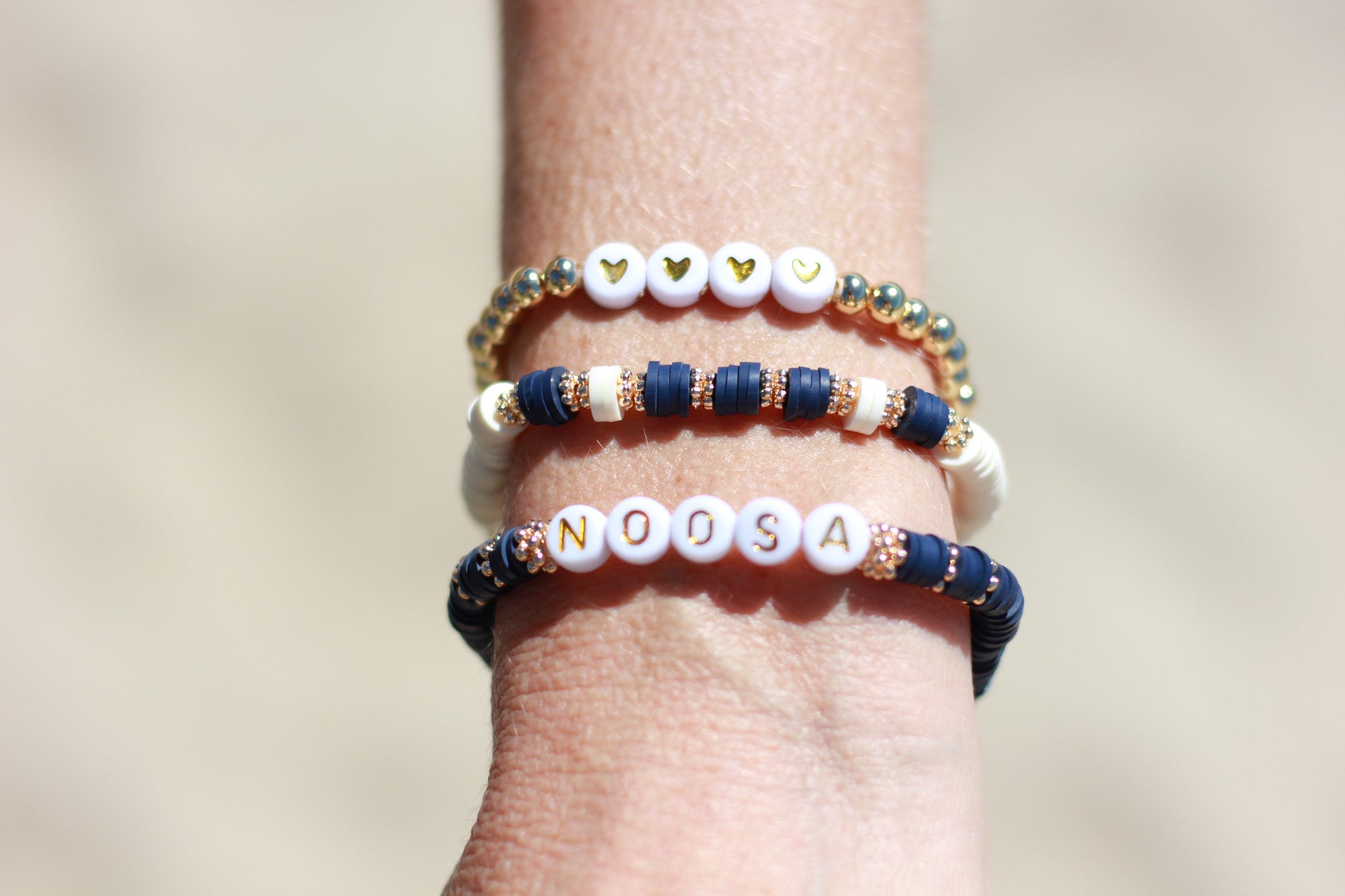 Pop Heishi clay disc bead, white and gold letters strung with durable stretchy elastic string making them easy to take on and off for daily wear.