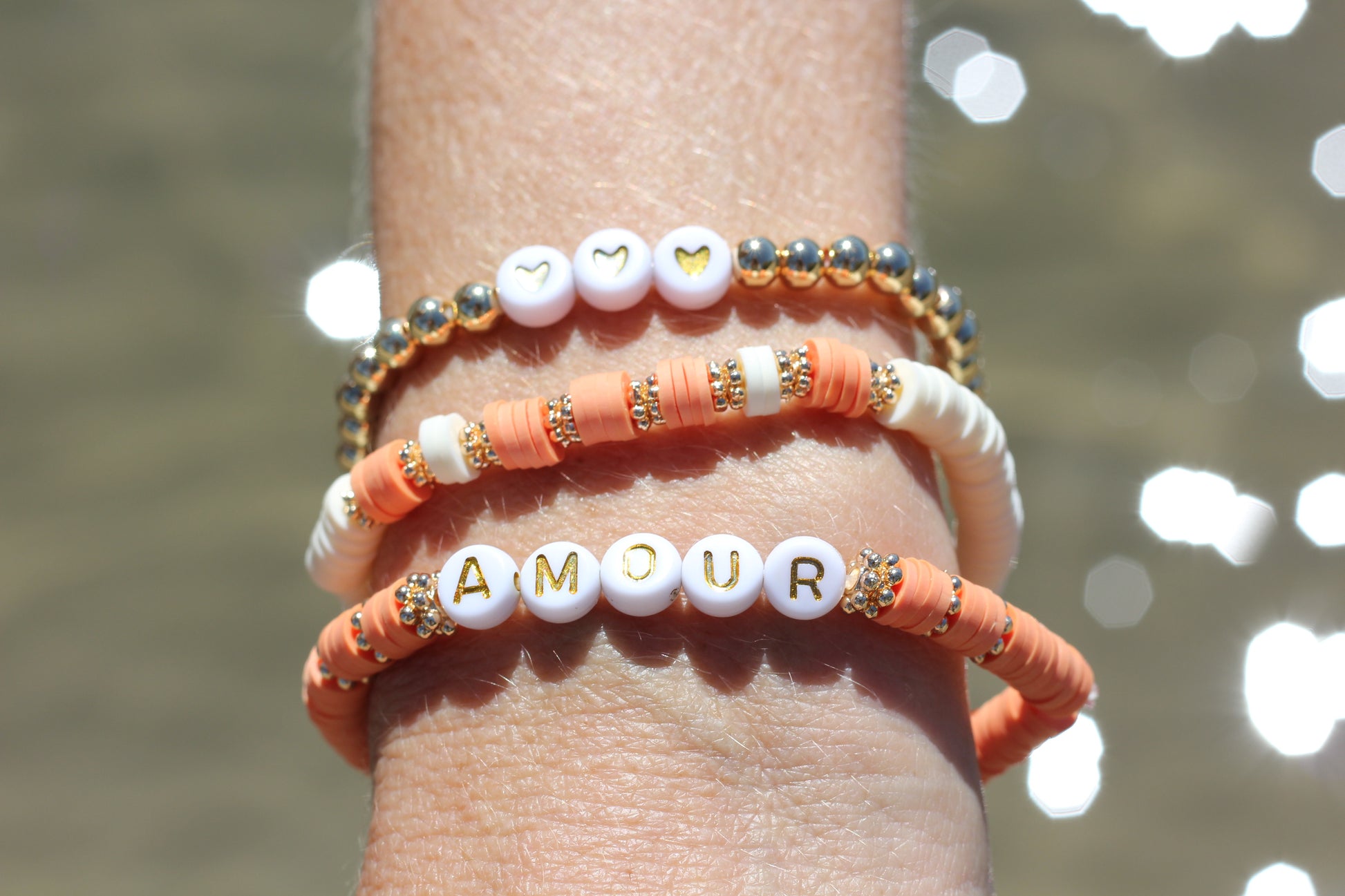 Pop Heishi clay disc bead, white and gold letters strung with durable stretchy elastic string making them easy to take on and off for daily wear.