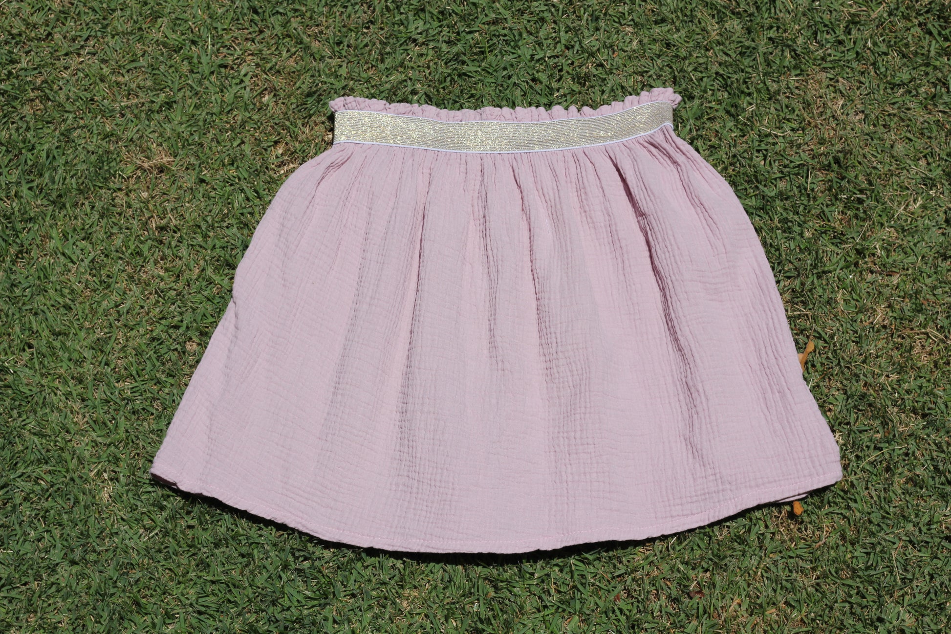 Short woman light pink skirt Harriet, double cloth fabric with golden elastic