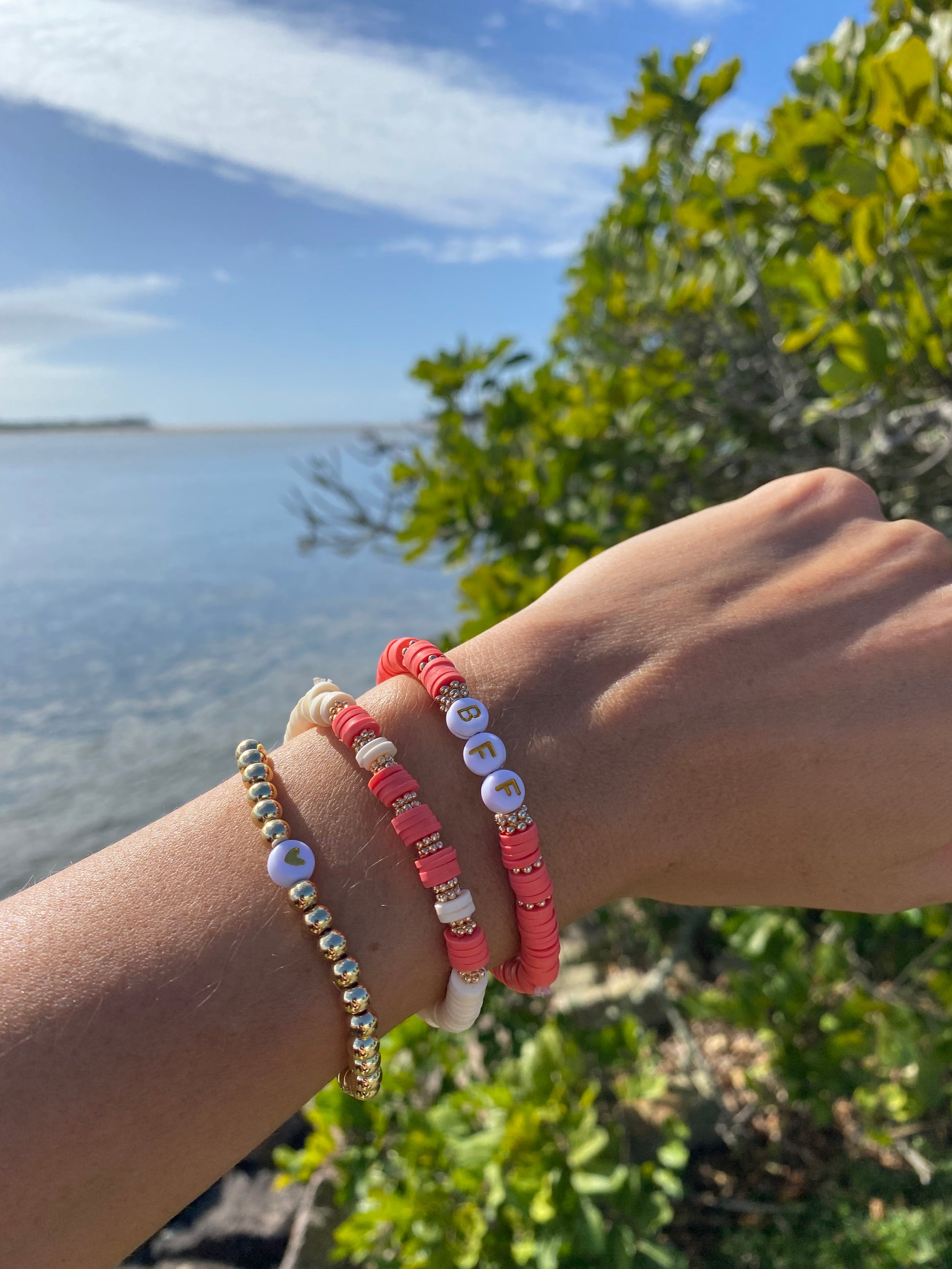 Pop Heishi clay disc bead, white and gold letters strung with durable stretchy elastic string making them easy to take on and off for daily wear.