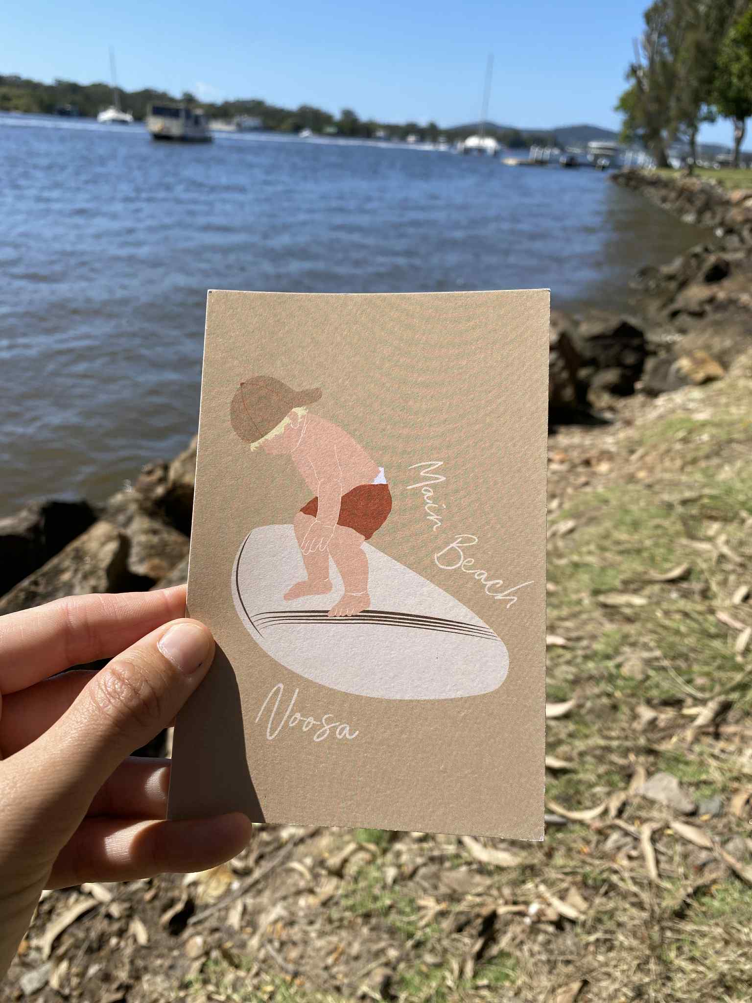 This charming postcard features an adorable toddler confidently riding the waves on a surfboard at Main Beach, Noosa. A sweet and playful design that perfectly captures the relaxed coastal vibe, making it an ideal keepsake or gift.