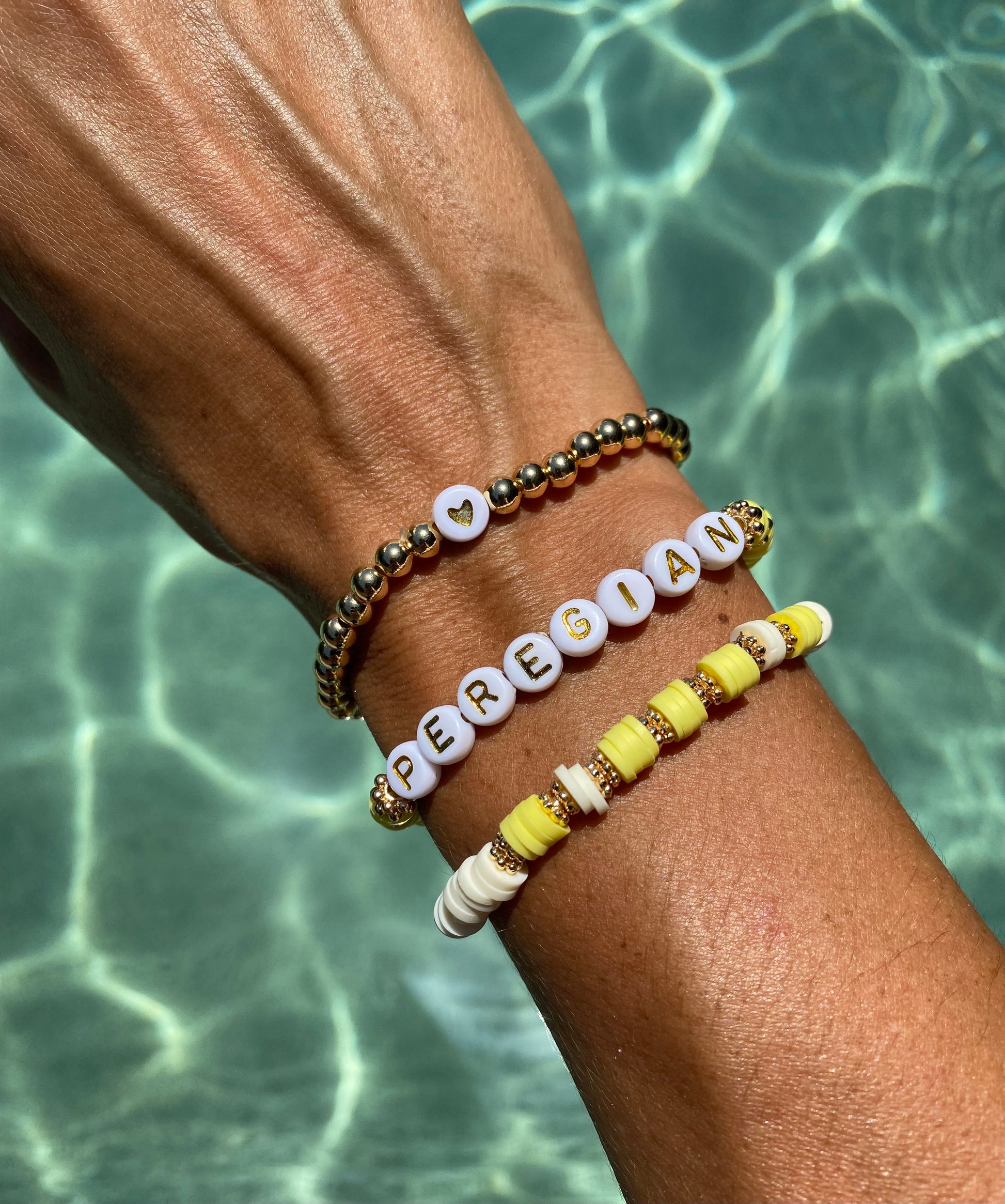 Pop Heishi clay disc bead, white and gold letters strung with durable stretchy elastic string making them easy to take on and off for daily wear.